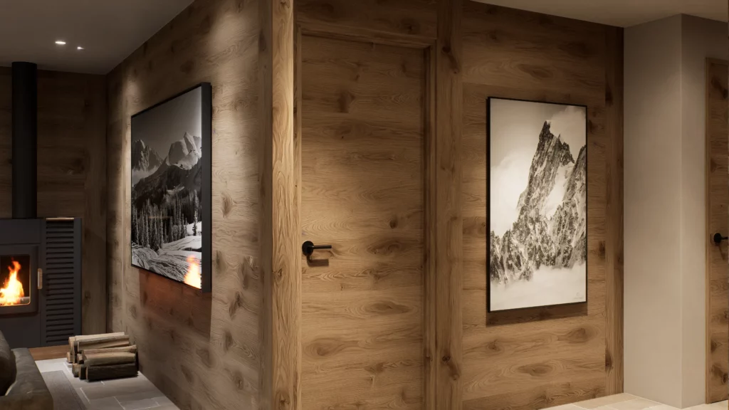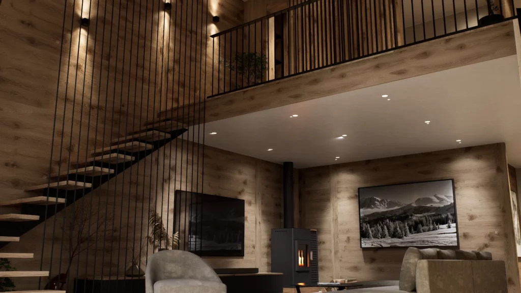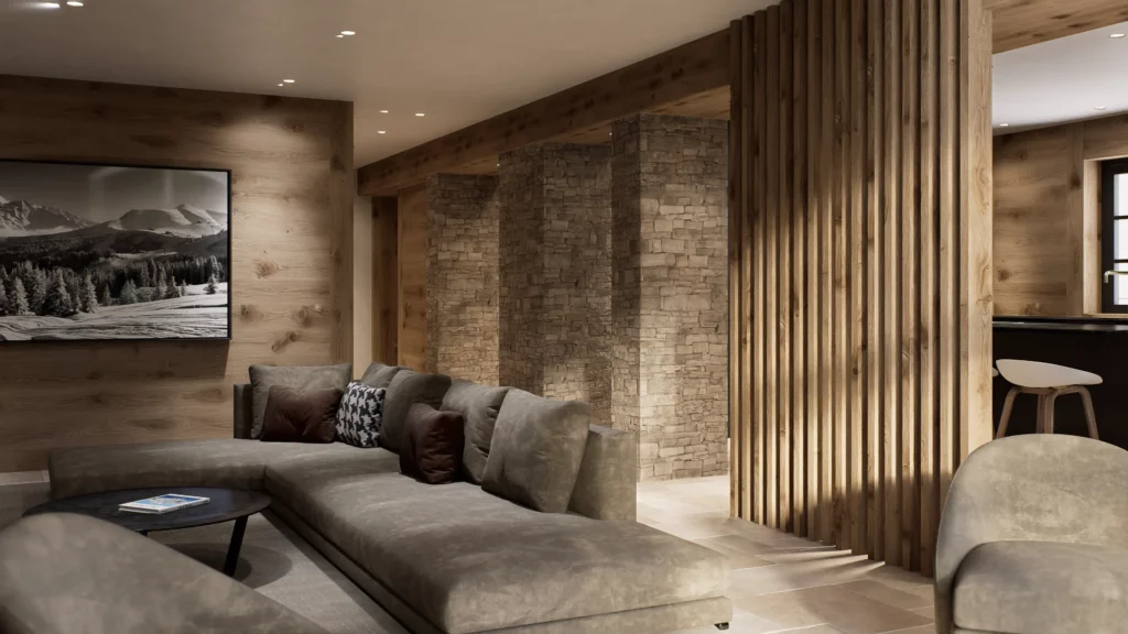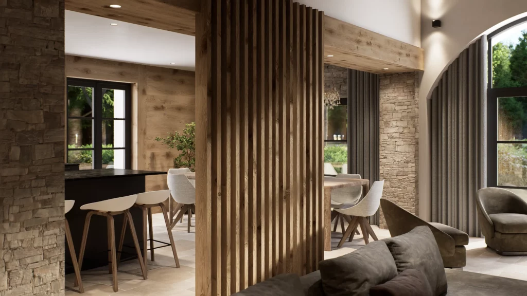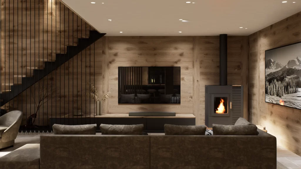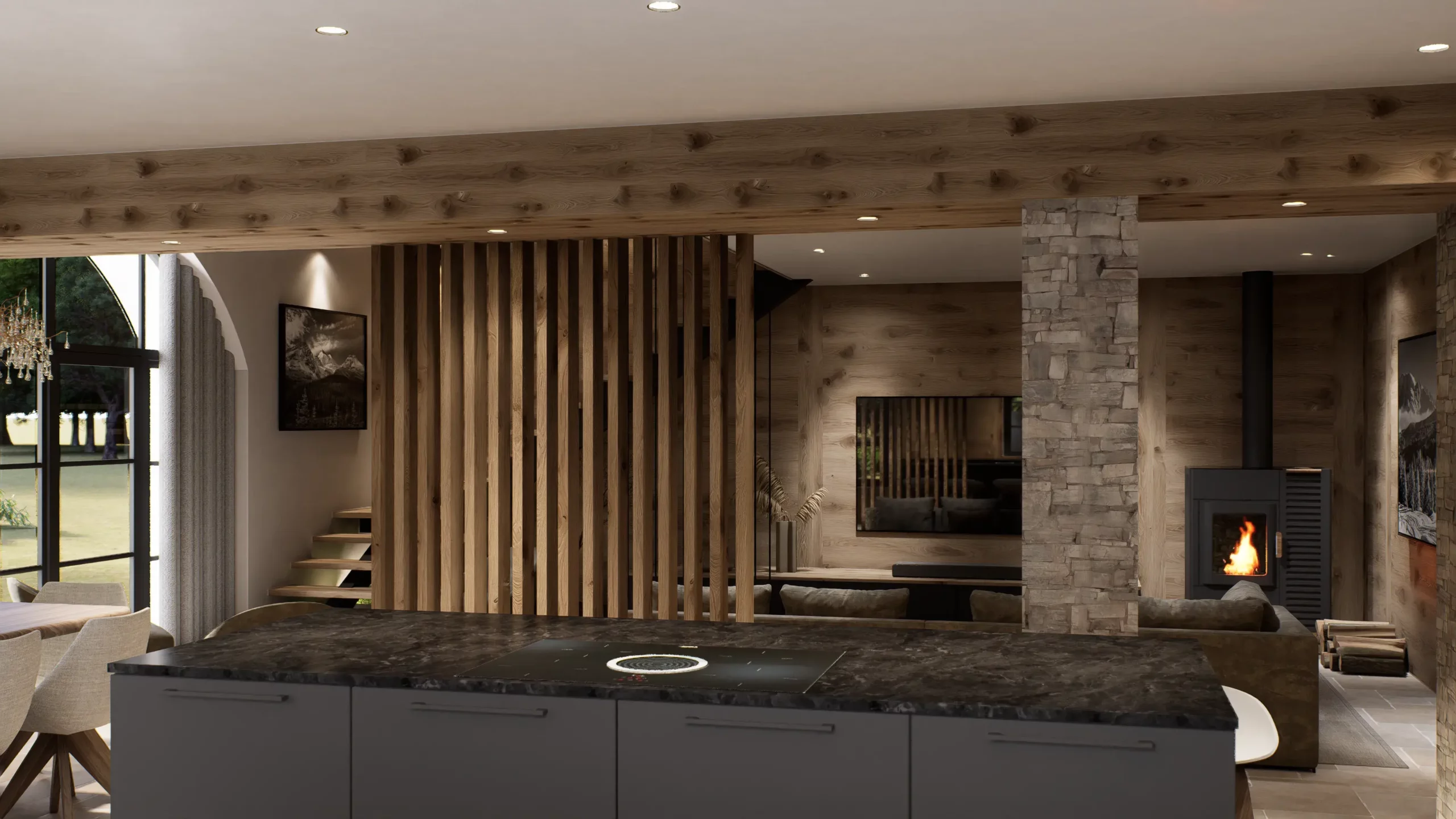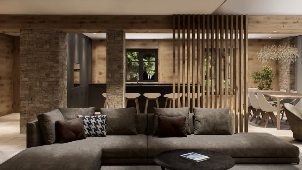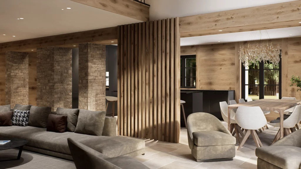 La pièce de vie centrale : un espace chaleureux, où le bois dialogue avec des lignes sobres et des finitions raffinées.