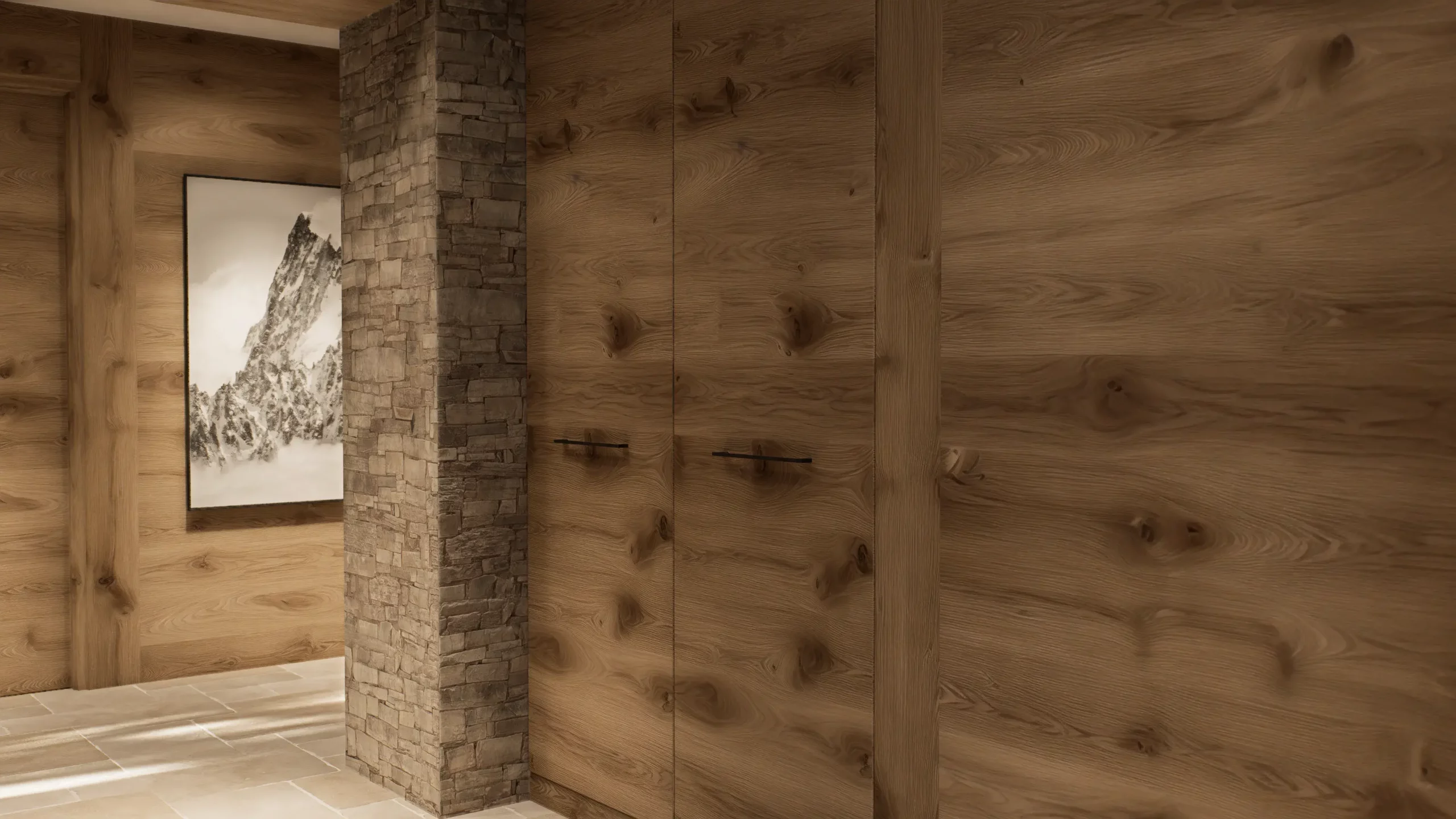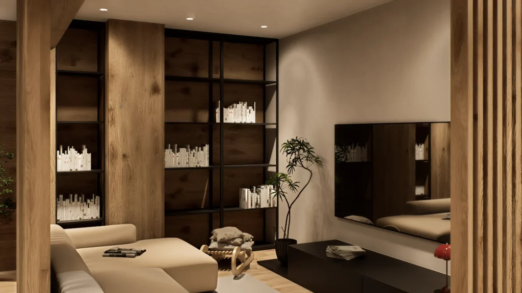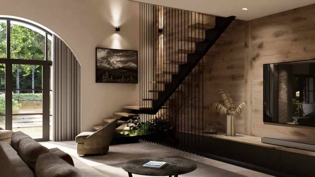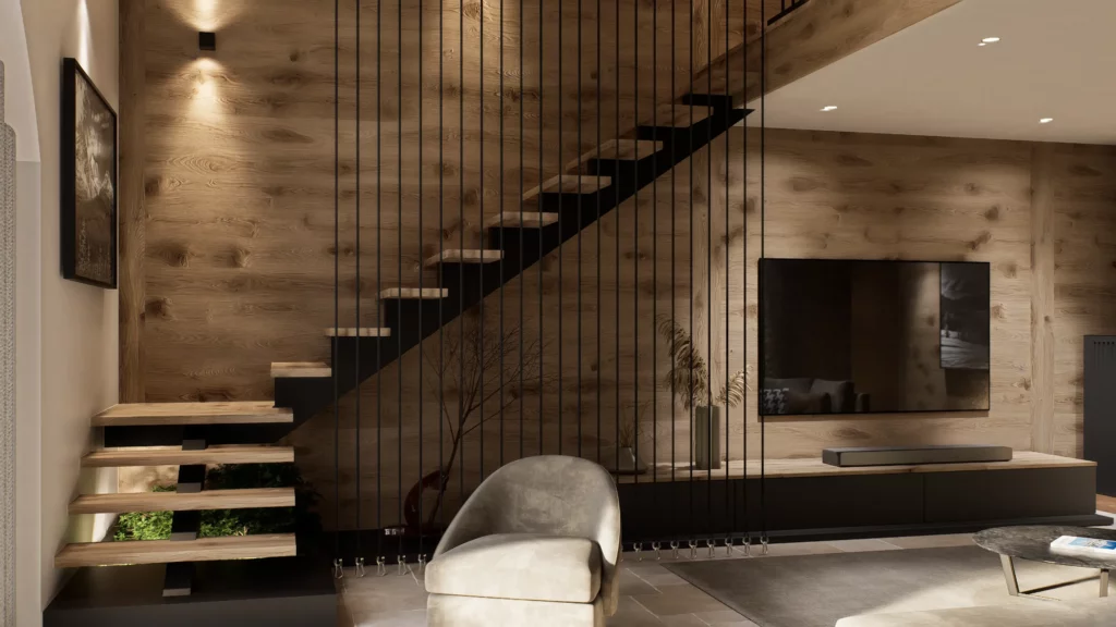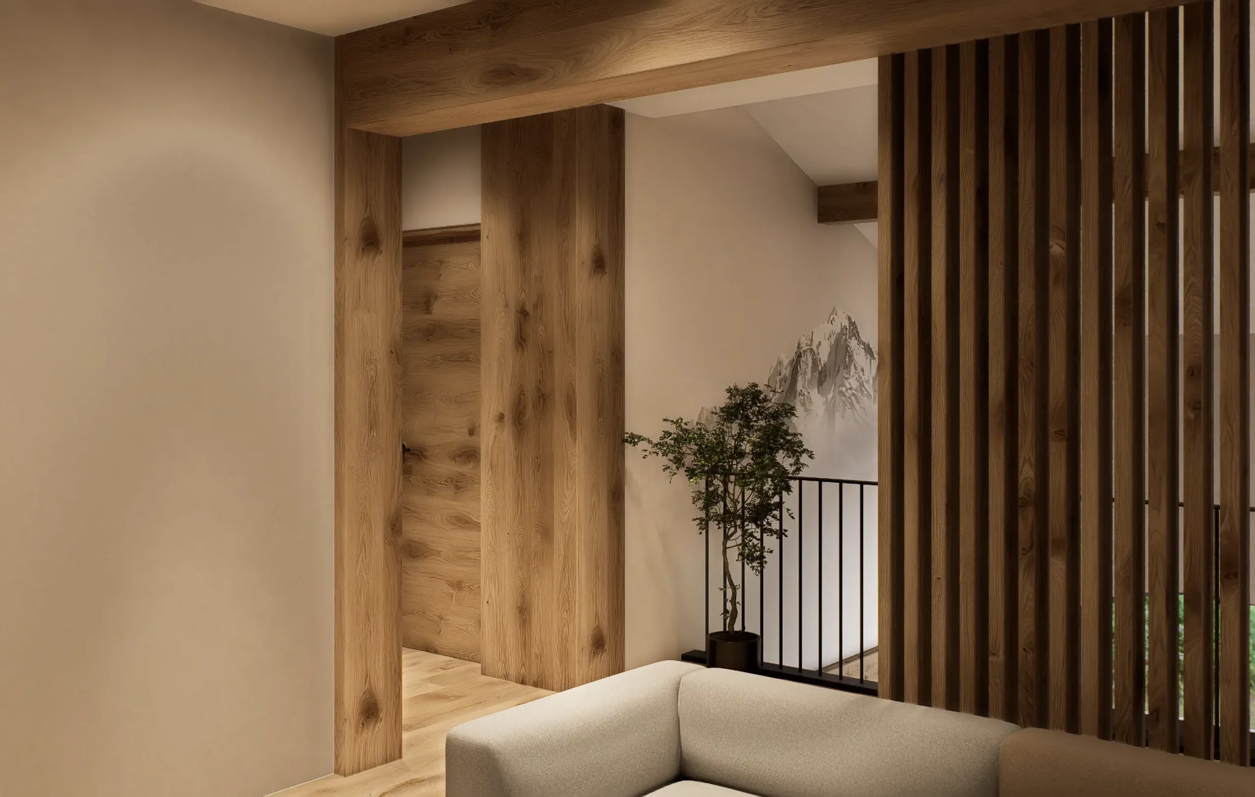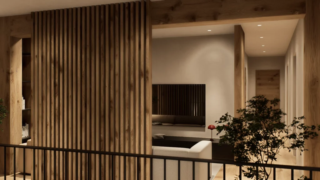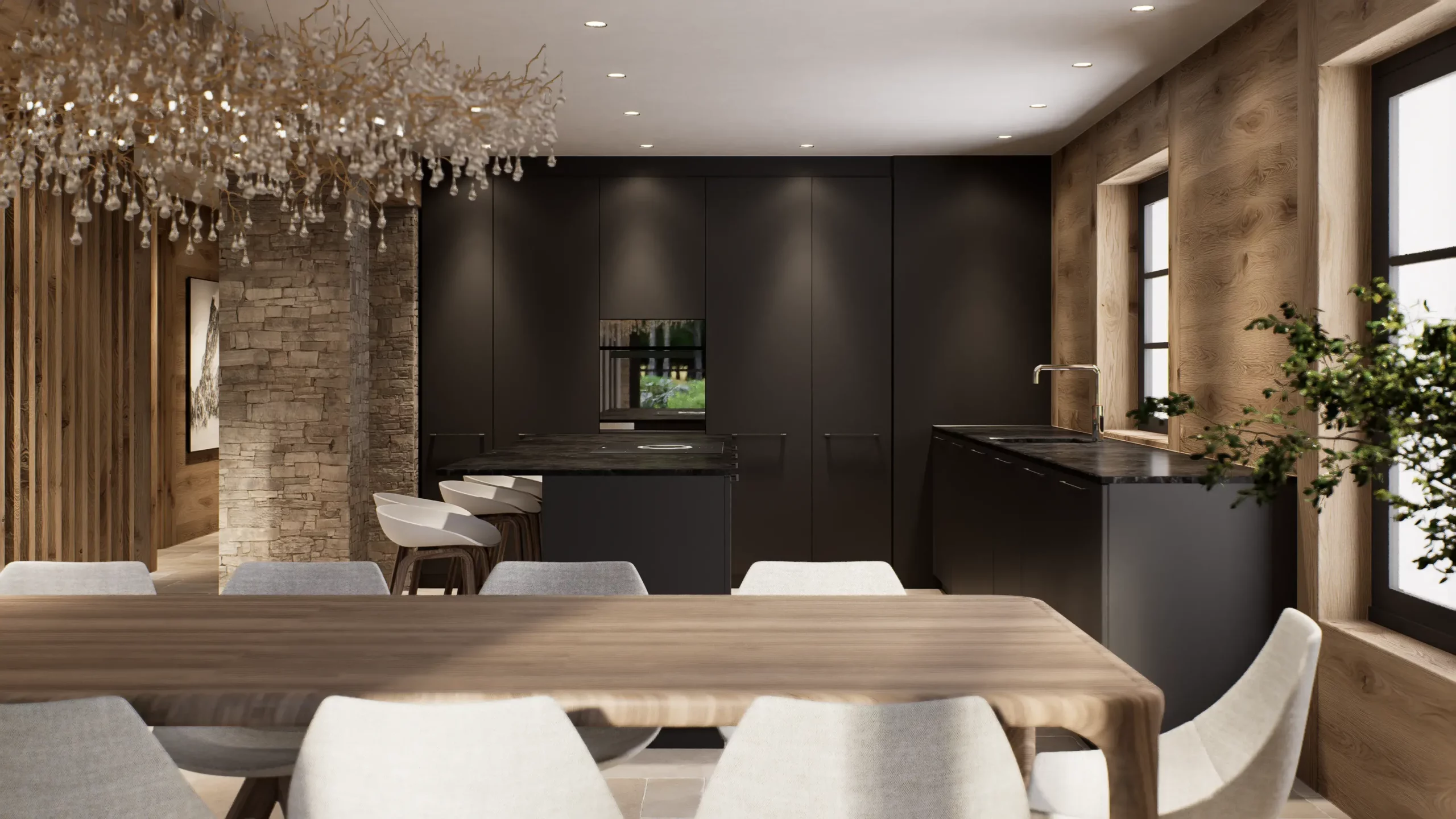 La pièce de vie centrale : un espace chaleureux, où le bois dialogue avec des lignes sobres et des finitions raffinées.
